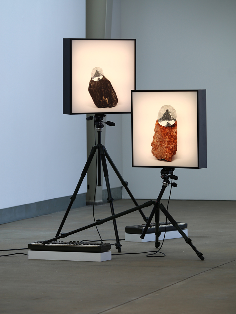 “I’d like for pretense to be set aside,” artist Richard T. Walker says flatly in the opening minutes of his two-channel HD video the predicament of always (as we are) (2014). Walker, the sole human who appears in his video, is standing on a desert expanse of rippling white sand, evocatively in conversation with the land and admitting his own frustration for not being able to get closer to it with language. He reiterates: “I’d like to bypass cliché, as valuable as it is.” Within a few moments, both channels turn to footage of Walker trying to balance palm-sized rocks on the flat speaker of a Panasonic cassette player. A small choir of unseen voices begins to melodically lull in concert with the strum of an electric guitar and the strokes of a Casiotone keyboard. The rocks sit, listening, until the scene turns to reveal them being picked up and tossed toward the frets of the guitars, which are now shown secured to tripods within the land. With each toss of a rock, a new tonality is amplified among the surrounding chaparral, grasses, and mountain vistas. Abandoned by his own words, the artist is coolly keen on taking his monologue and turning it into a dialogue.