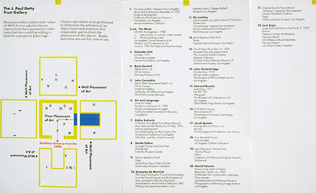 This is precisely what Cage did in his own prodigious curatorial undertaking, Rolywholyover A Circus. No labels interpreted or identified the works, but visitors could consult a map for identifying information. They could also consult “reference books by and about Cage, his interests and about the work of his contemporaries.” Many of the works were rotated on and off display during the exhibition’s run, so the returning visitor could not count on knowing anything about the show except its premise.