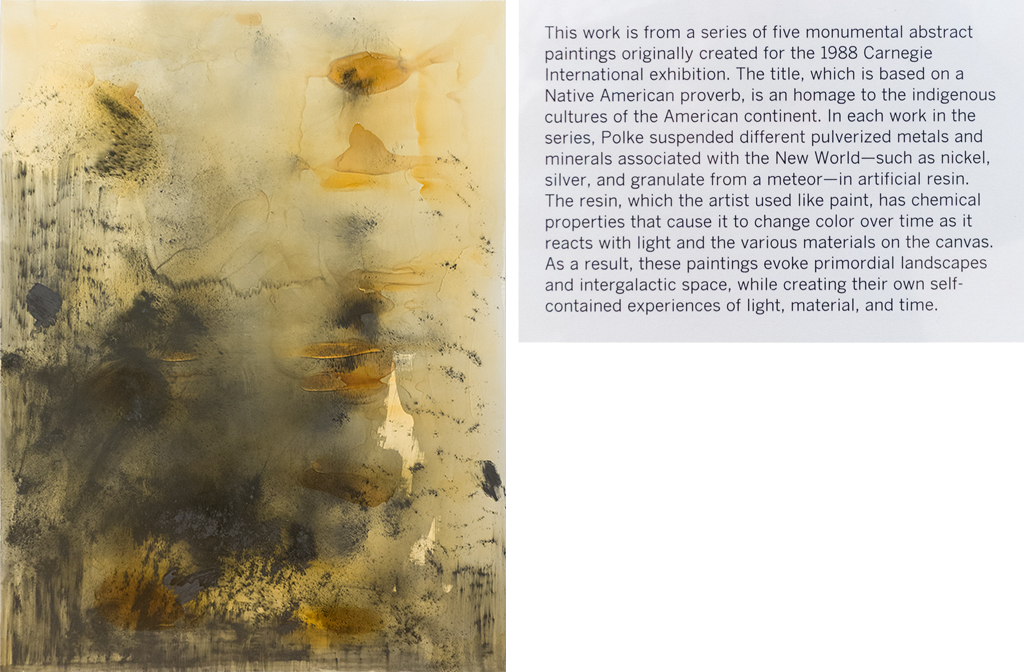 The label tells me what I might expect to discover in the artwork: Polke’s painting is a homage to American Indian culture, evoking a sense of support and unknowableness, or as Polke puts it “strength” and “invisibility,” honored in its source proverb. The label also tells me that the image is changeable—its chemical process evolving—and therefore, time-altering. The language is clear and gentle, but would I have felt as transported if I had read the label first?2 The label’s text risks displacing—or, worse, standing in for—my experience, although, is it ever possible to manifest the experience of art from the words that describe it? This is how the modern art museum has taught visitors to view art: to frame experience with interpretation. Yet, if a large part of what a person knows derives from the gifts of knowledgeable others, the part most likely to stick comes from—to paraphrase Cage—the questions that each of us asks during an entirely personal quest and the answers each discovers during that quest.3