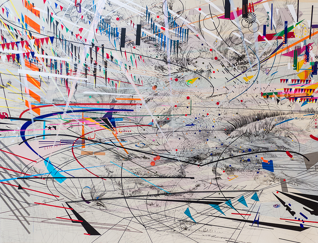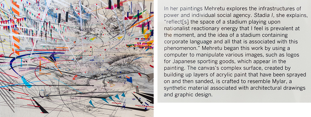 Mehretu’s Stadia I—with its shifts in scale and frenzy of stretching triangles and whipping curves—leaves me breathless. In the label’s text, Mehretu asserts that the painting reflects both the “nationalist reactionary energy” and “corporate language” of the stadium ecosystem. Indeed, the energy of the piece demonstrates the power of the stadium’s games to inhabit me, to make me part of the nationalist, corporate culture at which Mehretu takes aim. It is possible, however, to read Mehretu’s work without understanding these associations, to see it simply as an expression of dynamism. Does the label act to correct my experience—establishing the artist as the authority on her work—or does it set up a dissonance between the artwork and me? Does it cause me to abandon the work or to engage in a dialogue with the label rather than the painting? The artist knows the work better than I, as Mehretu’s label implies, but only if you believe Stadia I is merely an illustration of Mehretu’s intention or the curator’s interpretation. But if the work occupies its own center—to use Cage’s word when he describes the relationship between illustration and accompaniment—the label’s narrative is best deployed at a distance from the work, so that I might still benefit from Mehretu’s insight but not before benefiting from my own.4