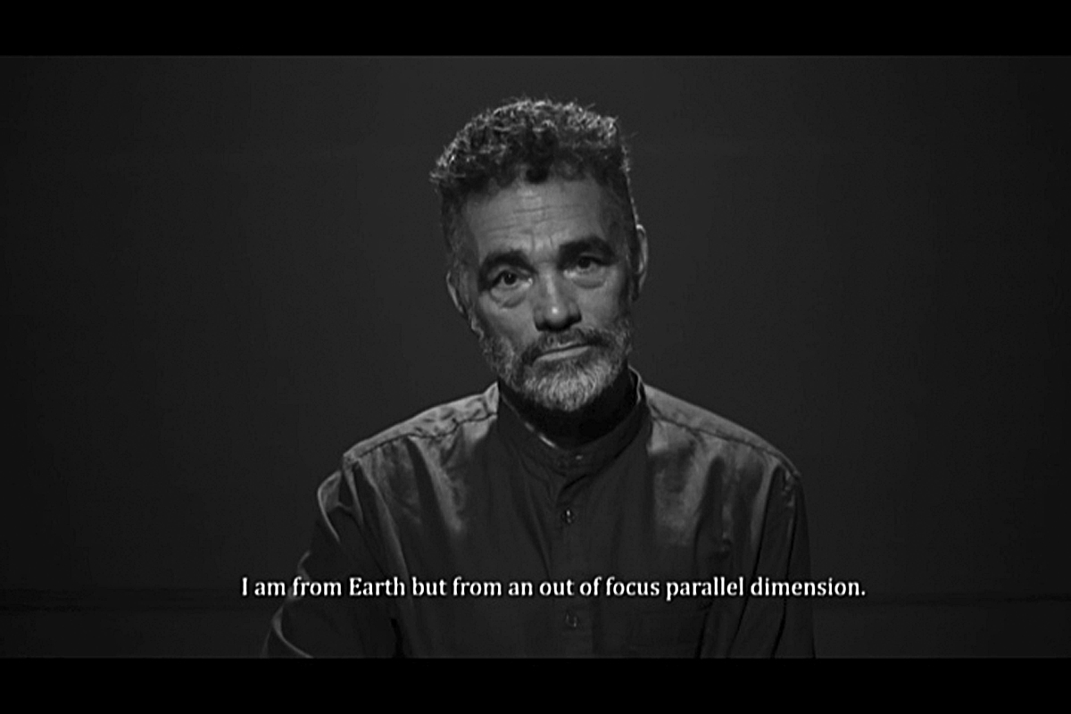 Viewers hear Murphy's voice but never see his face; the video is fixed on Ocula's face, with his dialogue appearing as subtitles, for he is able to communicate with Murphy telepathically. When asked where he is from—a question frequently posed to non-white people—Ocula explains that he is from an Atlantis-like place, on Earth, that had many races, brilliant artists, musicians, politicians, and philosophers. However, his home was invaded by Americans (as was Puerto Rico), and his people eventually disappeared from Earth to find refuge in an "out-of-focus parallel dimension."8 Murphy probes Ocula about his mission, asking him if he has come to infiltrate the United States. Like many immigrants who are tired of having to constantly explain themselves, Ocula simply states, "I don't have a mission," which Murphy refuses to accept over the course of the interrogation.9