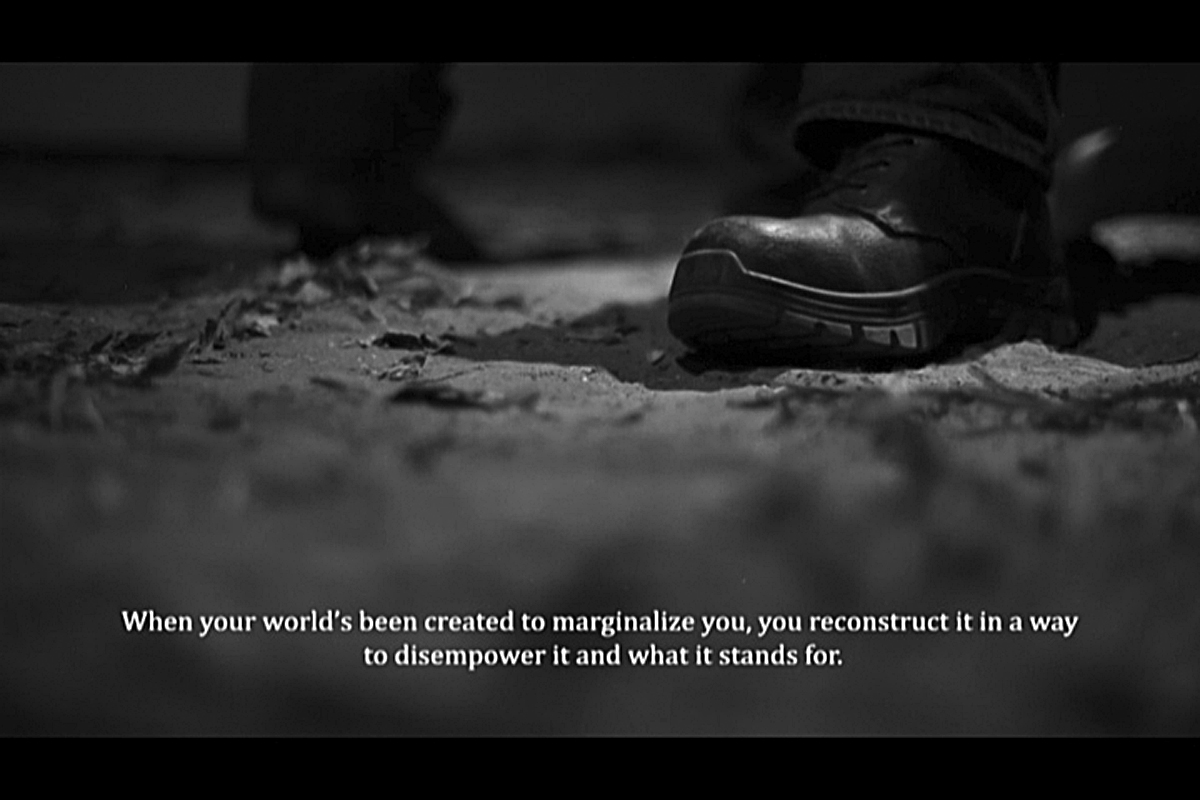 Of course, Asians are not the only targets of suspicion of otherness. Being both immigrants and dual citizens, Puerto Ricans possess a hybrid status, which arose from the island becoming an unincorporated territory of the United States after the Spanish–American War (1898). In a series of U.S. Supreme Court decisions that began in 1901 (known as the Insular Cases), the U.S. defined Puerto Ricans as an "alien race" and "foreign in a domestic sense," and in 1917, the court granted U.S. citizenship to Puerto Ricans.5 In La Coconaut Interrogation (2017), the Nuyorican (New York Puerto Rican) artist ADÁL explores this state of hybridity and the suspicion that it triggers.6 The sparse black-and-white video chronicles the interrogation of Agápetu Ocula, a Puerto Rican vision scientist, after NASA found him on the moon. Today we know that undocumented aliens are detained after Immigration and Customs Enforcement (ICE) raids; in ADÁL's video, NASA's Air Intelligence Center for Interrogation quarantines and detains Ocula, keeping him in a dark space and under maximum security, supposedly for the safety and comfort of the "alien." Because Ocula appears human, with plain and reserved gestures, Special Agent Wayne Murphy remarks, "You look like us—an earthling, that is."7 Murphy's dialogue points to the power of appearances and the division of us as either American or human.