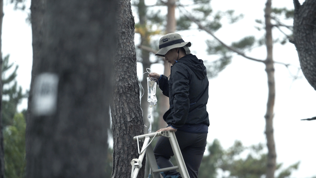 Like the trapped lion and the broken parts, Cha offers the tree as a metaphor for this system. Halfway through the work, the voices cut and the focus turns to the tree’s cultivation: its pruning, feeding, and the IV bags filled with nutrient sap tied to its trunk. Like the university students provided with resources for growth and survival, the tree is nursed before moving to its full-time job watching over corporate workers. In a conversation with the artist, Cha mentioned that this parallel also pertains to an interest in visualizing a certain “psychological landscape” of the counselors and their patients—as trees, on a highway, not knowing where they’re heading.2