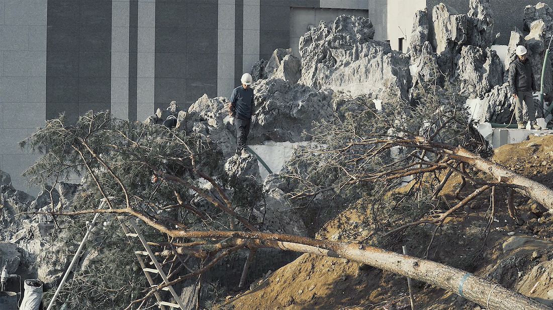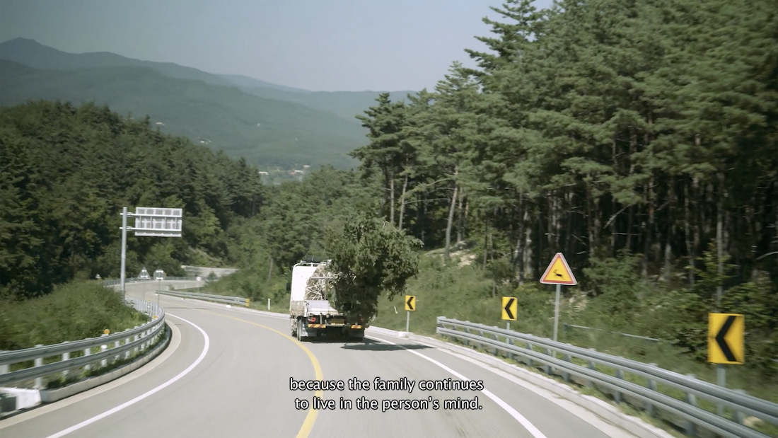 Jeamin Cha’s single-channel video Sound Garden (2019) is one of two on view in her upcoming solo exhibition at KADIST, San Francisco.1 The video opens with the familiar humming of a car as she films through a windshield while rolling down a South Korean highway. Cha follows a pickup truck as it carries a single pine tree making a four-hour journey from Gangwon-do—a popular seaside getaway—to Seoul. Farmed for the purpose of decorating the surrounding landscape of a gray, glass-clad, multi-story building in the country’s capital city, the tree’s stick-straight trunk and symmetrical branches appear to be as highly produced as the office park that appears at the end of the thirty-minute work.