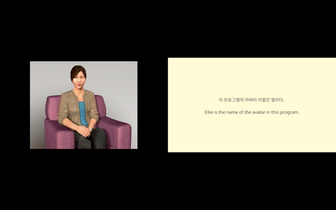 After this conversation wraps, a 3D animated woman sitting in an armchair appears. This is Ellie, a present-day version of ELIZA and the avatar for the SimSensei therapy bot project at the University of Southern California. A quote from the project’s co-leader pops-up: “I think we’ve always had [non-human interactions that can be comfortable]. I mean, do you talk to your cat?” This is Cha’s most obvious link to the video’s dog-focus and the notion that there are benefits that come from talking to a pet or AI proxy to develop inner dialogue and well-being.