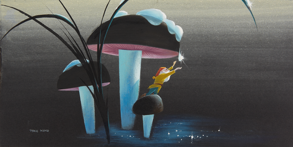 “I don’t know what I could do. I could be a Picasso,” says animator and painter Tyrus Wong with a chuckle while discussing his retirement.1 For 103-year-old Wong, who leads a quiet life building kites in Santa Monica, becoming Picasso seems like one of the few things he’s yet to do in his long and varied career. Wong began his artistic endeavors as a landscape painter, taking odd jobs to fund his practice, and then moved into animation and film in his late twenties, and continued to work for major animation studios for over thirty years. But it is only recently that the breadth and impact of his work has gained the attention it deserves. In 2004, the Chinese American Museum in Los Angeles exhibited a retrospective of his work curated by the author Lisa See. Since then, his work has been exhibited at the Academy of Motion Picture Arts and Sciences, the Vincent Price Art Museum, and the Walt Disney Family Museum.
