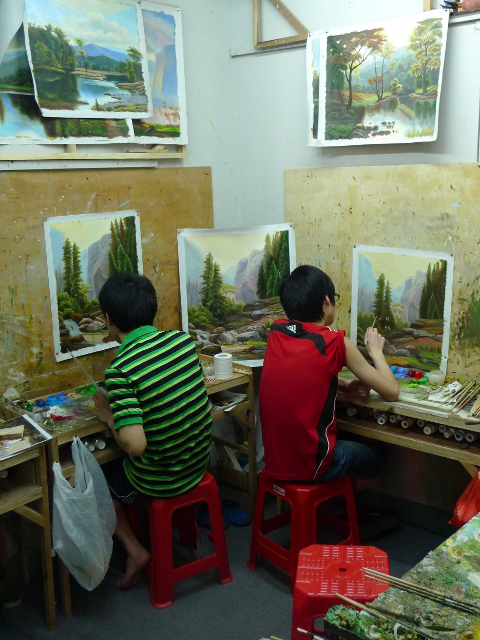 Two apprentices at work in a Dafen studio, 2012. Photo: Winnie Wong.