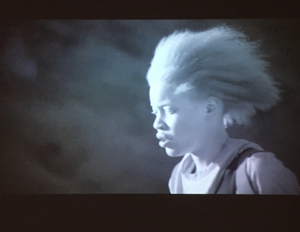 The film's black-and-white palette abstracts the landscape, such that the desert and a modest building (like the farmhouse Nkoloso used as a headquarters) shift between being possibly Mars or Earth. With the film’s stillness and scenes of a solitary Matha looking at the moon, Bodomo suggests the marginalization and Otherness of Africans in global contexts. The lack of color also transforms the skin of the African American albino actress Diandra Forrest, who plays Matha, into shades of gray; at moments, it is difficult to place her racially or determine if she's of this world. Moreover, Bodomo's use of grayscale creates an abstraction of temporal distance and dreamlike quality.