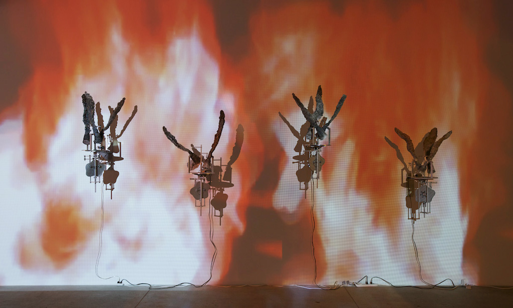Carolee Schneemann. Flange 6rpm, 2011-13; installation view; foundry poured aluminum sculptures, motors 6 rpm each unit; 7 units, 9 x 20 x 3 ft. Courtesy of the Art Matters Foundation. Photo: Susan Alzne.