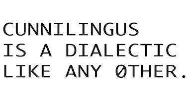 Representative of their work, Cunnilingus in North Korea (2003) is an animation that features a text that YHCHI claims the late Kim Jong-il wrote and asked them to distribute. The piece champions the sexual prowess, sensitivity, and selflessness of North Koreans, as compared to their South Korean neighbors. “Dialectical sex,” Kim explains, is a national priority for his government and people. His message takes the form of generic communist propaganda speeches, with talk of equality, Marxism, bourgeois inhibitions, and capitalist gender oppression. But instead of preaching usual proletarian morals of hard work and party loyalty, Cunnilingus in North Korea instructs on the instrumentality of free and frequent cunnilingus.