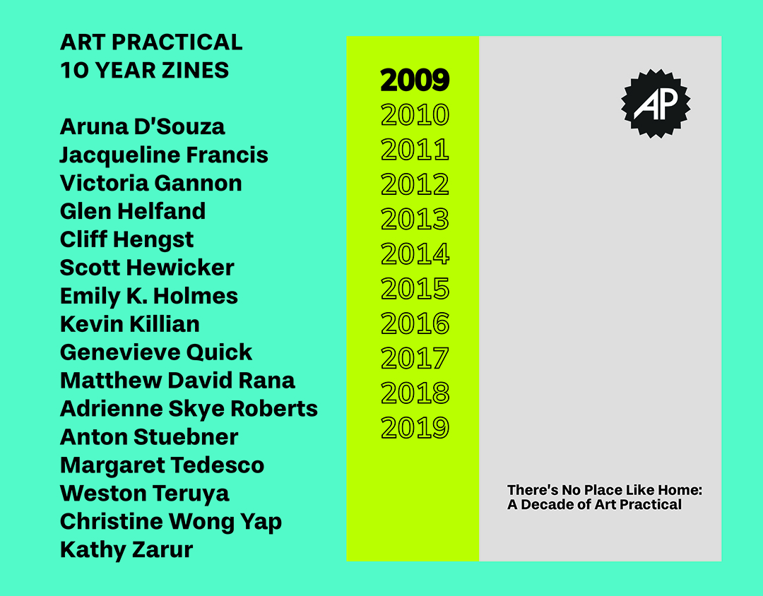 Zine sets and editions will be available upon donation. Your generous donations will help fund our current initiatives, stretch our imaginations, and foster new content for the future. Art Practical started ten years ago as a volunteer-run organization, with a passionate group of contributors who saw the need for Bay Area arts to be represented in international arts discourse. Ten years later, we have mentored a new generation of arts writers and offer competitive pay. We are run by an equally passionate small team of part-time staff, who work hard to support voices that reflect the Bay Area arts community and beyond. Your support will enable us to grow as one of the only remaining publications dedicated to covering arts and culture in the Bay Area.