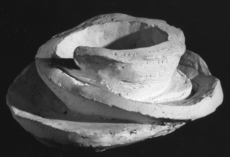 Bruce Nauman. Cup Merging with its Saucer, 1965; unglazed ceramic and graphite; 2 x 5.5 x 6 in. Courtesy of the UC Davis Nelson Art Gallery.