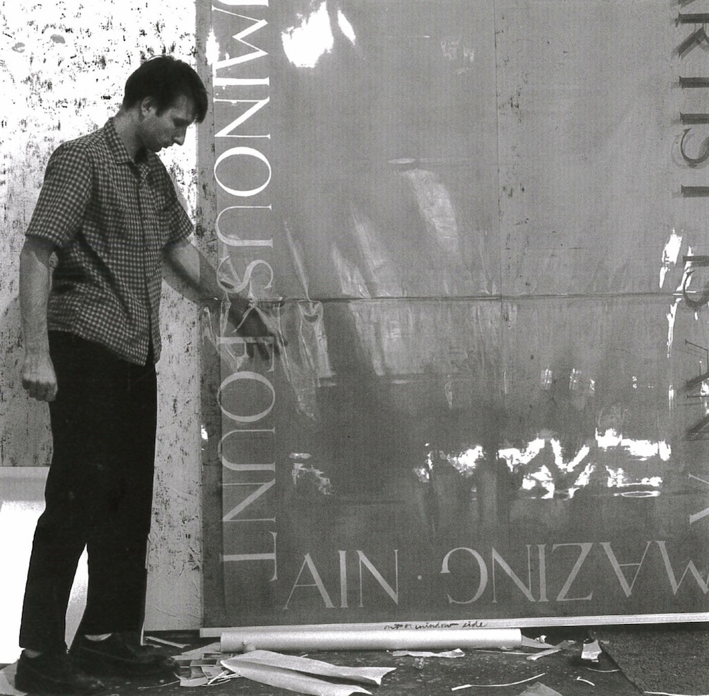 Bruce Nauman in his San Francisco studio, c. 1966 with The True Artist is an Amazing Luminous Fountain (Window or Wall Shade), 1966.