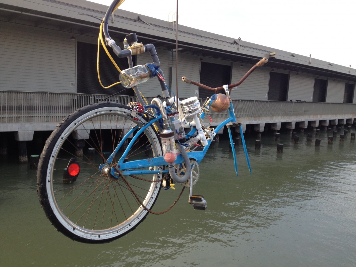 The Exploratorium’s culture embraces a good experiment. Many artists relish the chance to work in our shop with experienced designers and engineers who can help them realize new possibilities in their work. Our current Over the Water project, Bosun’s Bass (2015), a monumental, tide-activated sound work, is a great example of this; the artist Tim Hawkinson worked with a team of engineers and designers to develop the work. A shipping container, pitched vertically in a hole in the deck of the Exploratorium’s outside plaza, is connected to the bellows from an articulated Muni bus to create a two-stage bellows, similar to what one would find in a pipe organ. As the tide rises up into the shipping container, the chamber fills with air and the bellows expands. Air from the bellows flows through a tube to a nearby bicycle, the tread of which is inscribed with patterns that triggers a series of valves and levers to produce twenty-one bosun’s calls (a pipe or whistle used on naval ships by a boatswain). This experiment with the physics of sound produces haunting tones that recall San Francisco’s maritime past. Hawkinson’s process of developing Bosun’s Bass compelled us to ask: How did the boatswain’s call develop into an international maritime language? Can wakes in the Bay generate as much air pressure as the rise and fall of the tide? How does the mouth move when we trill?