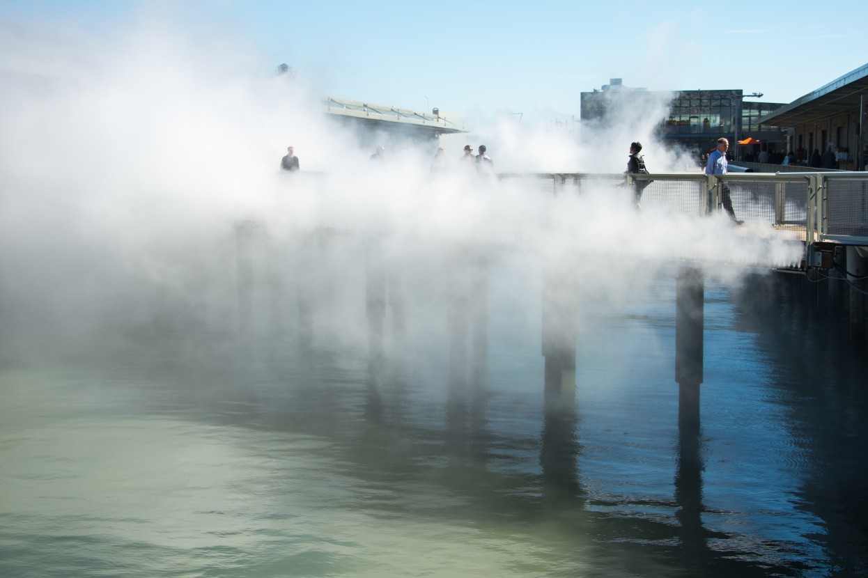 Nakaya’s ephemeral work Fog Bridge, located on a pedestrian bridge spanning Piers 15 and 17, makes the normally hidden conditions of the atmosphere palpable and heightens our observation of the weather with its ever-changing, billowing clouds. When standing on the bridge, one can lose sight of an outstretched hand as it disappears into the fog. Fog Bridge provokes us to wonder: How does fog form in the atmosphere? Why does fog obscure vision? Why don’t we celebrate San Francisco fog?
