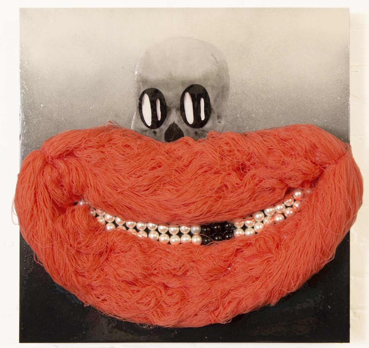 Marika Kandelaki. …the abyss will also gaze into you, 2015; yarn, spray paint, acrylic, epoxy resin, printed paper on panel; 24 x 24 in. Courtesy of the Artist.