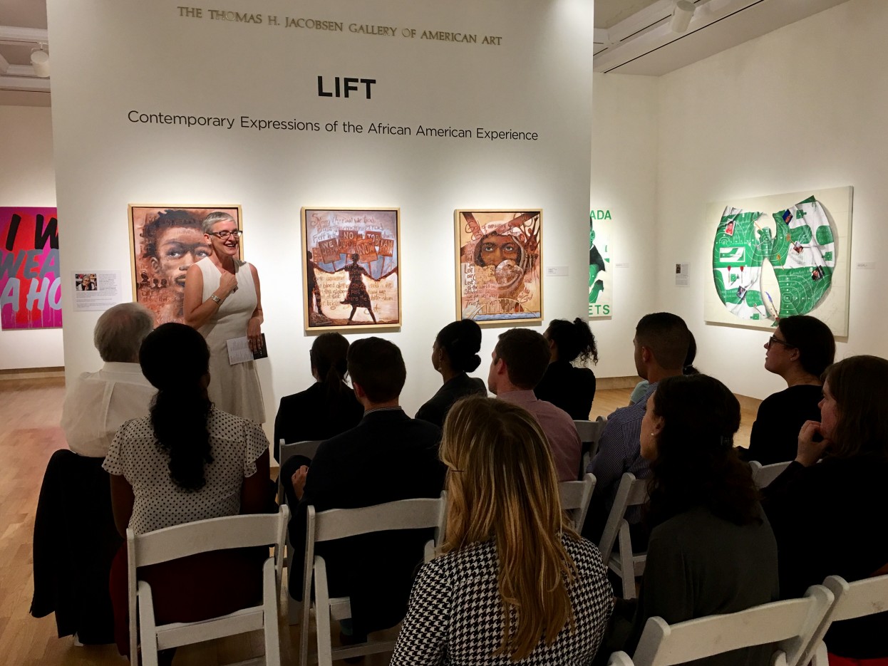 Hope McMath, then-director of the Cummer Museum, speaking to a group of museum visitors about the exhibition LIFT: Contemporary Expressions of the African American Experience in 2016. Photo courtesy of Chrys Yates.