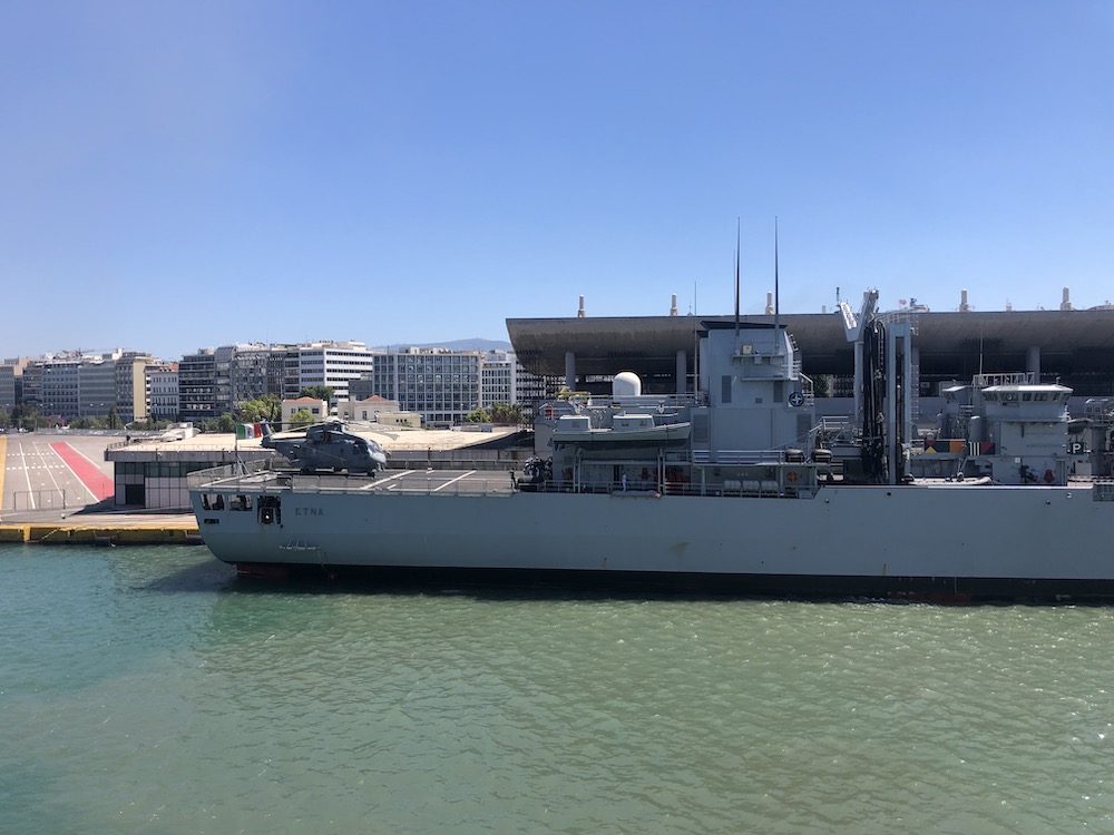 Joint Italy-EU military vessel with helicopter, Piraeus Port, Greece, August 2019. Photo: Anuradha Vikram