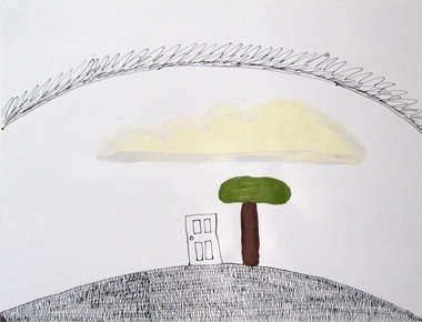 Landscape drawing w/ door and painted tree and cloud, 2010; pen, ink, and acrylic on paper; 22 x 28 inches. Courtesy of the Artist. Photo: Rema Ghuloum.