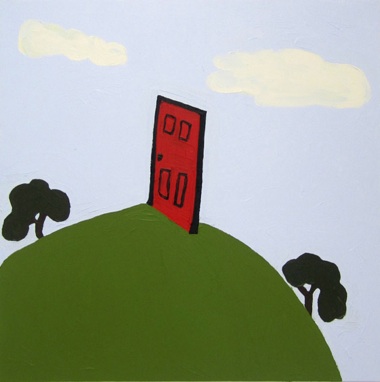 BF: I've seen those early drawings, and these paintings are much more deliberate. The early drawings have a frontal image of a door, presented head on, with a sort of schematic horizon. These paintings are similarly direct, but the landscape is comprised of voluptuous shapes, and the door is perched in quirky and impossible places that continually throw the scale out of whack. In the early drawings the landscape is at the service of the door, whereas here the relationship is harder to pin down. It’s interesting that in the paintings the door, impossible as it is, doesn’t seem magical. It’s an entry point, but it doesn’t seem to enter into anything except the experience of viewing the picture—it doesn’t read as a portal to another dimension.