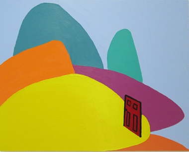 While the paintings are squarely in the realm of representational image making, the means of their construction leans heavily on the tools of abstract painting. Elesby defines her compositions with hard-edged but voluptuous overlapping shapes filled with uninflected expanses of acrylic paint. Her colors strain at the limits of traditional landscape logic that says that warm colors should come forward while cool colors should recede. In one painting, a bright orange hill delineates the horizon along with its forest-green twin, while the foreground is described by a large deep blue “hill,” whose lower left edge hovers like a precipice above the bottom edge of the painting. Scale is likewise fluid and sometimes arbitrary. The red door often appears in contradiction to the scale of the space it seems to occupy. It’s hard to tell how big or small anything is supposed to be, though incredibly enough, the landscapes have a feeling of real space.