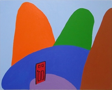 Elesby’s most recent investigation takes a sharp turn away from the material focus of those works, and even seems to have abandoned abstract concerns altogether, though close attention proves otherwise. Her new paintings initially present as faux naïf landscapes with cute and even folksy overtones. Each painting features a schematically rendered red door, and sometimes includes rudimentary trees and even more rudimentary clouds. Depicting impossible vistas in vivid hues, they look like a cross between a cartoon landscape and a child’s drawing, but despite this ingenuous appearance, the paintings have substantial perceptual and narrative complexity.