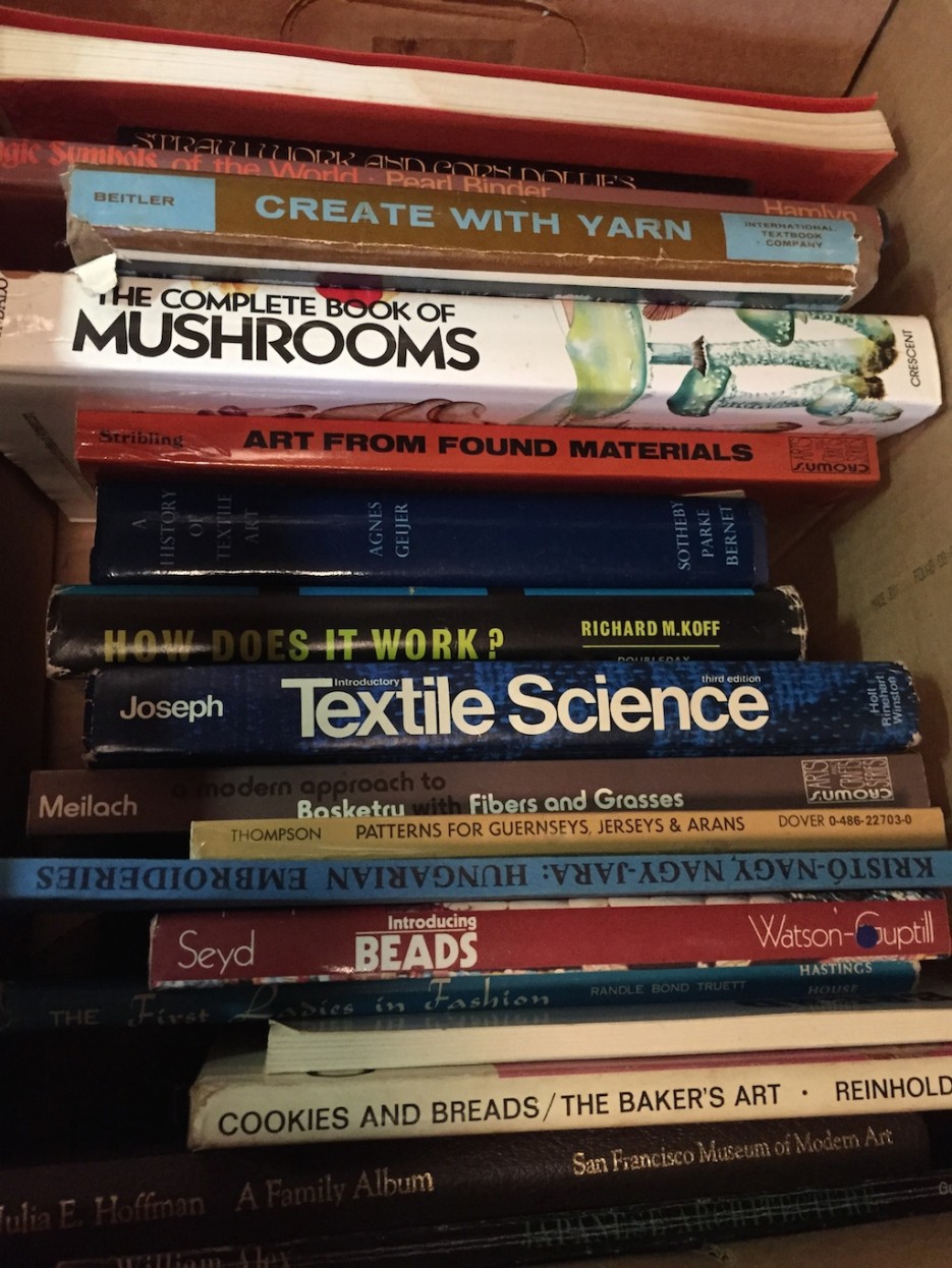 Education in the arts—its sources, its costs, and its value—is a topic of discussion across the globe. With regard to textiles, the transfer of knowledge of material processes ranges in method: person-to-person, book-to person, hand-to-machine, and even YouTube-to-artist. Those interested in natural dyes, for example, can learn through workshops in a variety of academic, guild, and independent contexts, such as the Wildcraft Studio School. Recipes abound, particularly in older and mostly out-of-print publications and pamphlets from past decades, such as some from a private collection I recently examined in Monograph Bookwerks with the store’s owner, John Brodie. Talking with Brodie was like communing with a human card catalog; each question from a book in the box led to the examination of other books in the bookstore. Brodie’s visual essay offers a sampler of types of older books, revealing a body of collected knowledge frequently overlooked, even dismissed, in today’s theory-based academic discourse. And yet, these technical, popular, and historical publications, which pass through used bookstores and the Goodwill, offer a breadth and wealth of knowledge that was once available specifically for women studying home economics and textile engineering.
