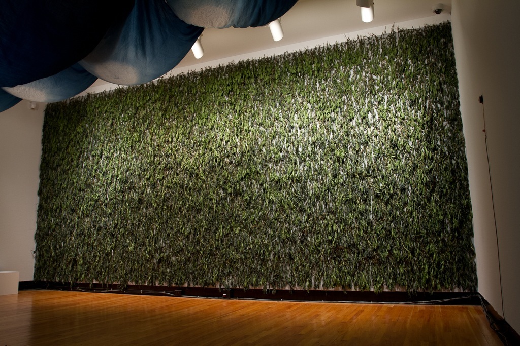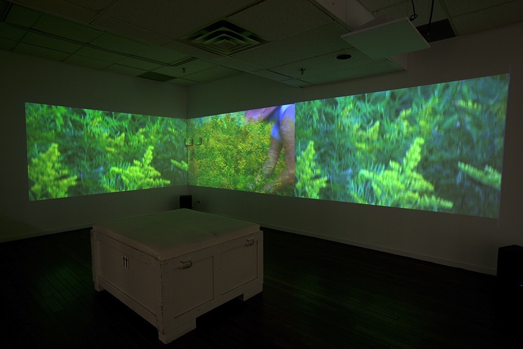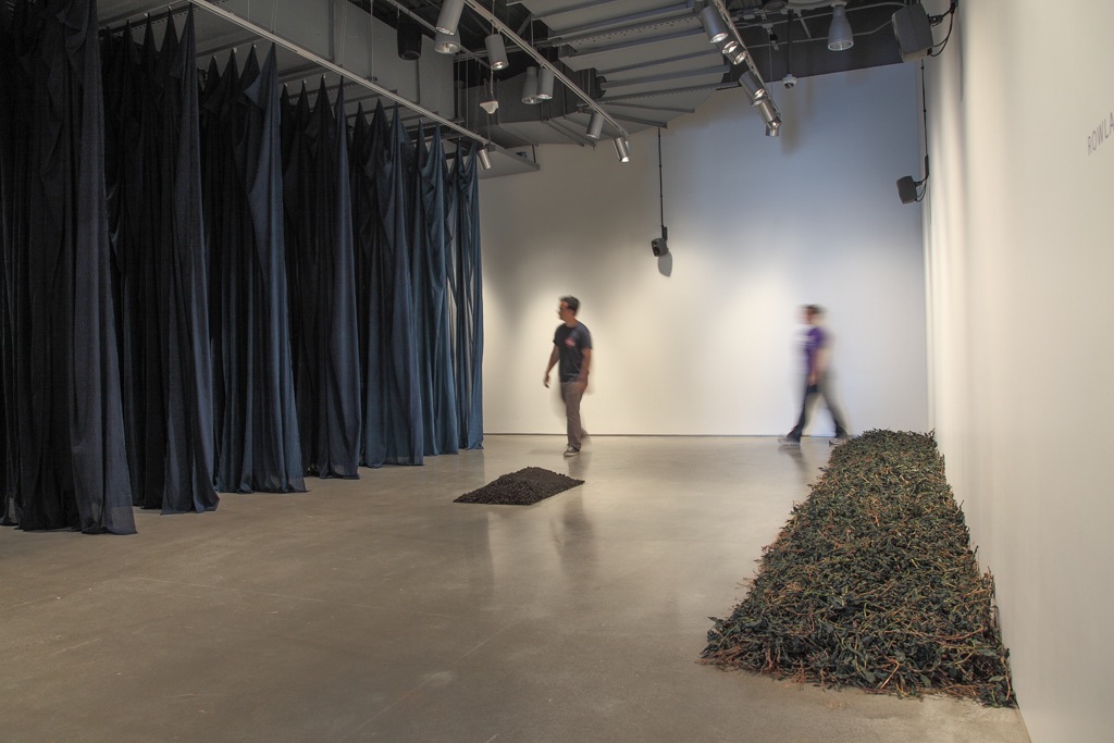 Rowland Ricketts, III. Fields of Indigo, 2012; Dried and fresh indigo plants, indigo dyed ramie, indigo dyed silk, video projection, six-channel interactive sound by Norbert Herber; Installation view at the Krannert Art Museum, University of Illinois, Champaign-Urbana, IL. Courtesy of the Artist.