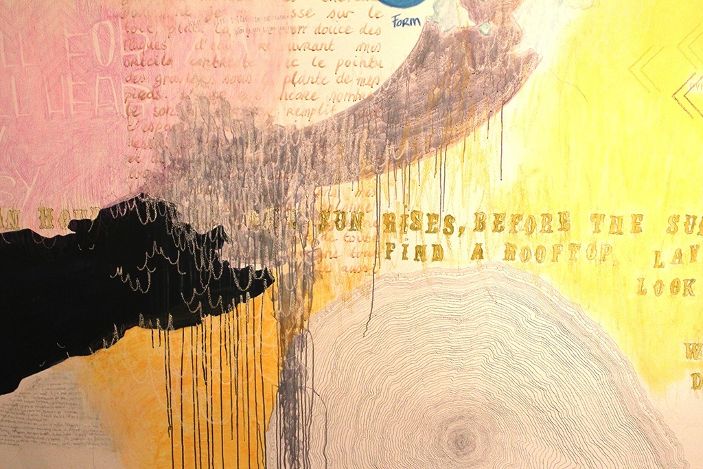 The Color Collective. RE: Spec-trum (detail), 2012; Natural pigments, colored pencils, chalk, mail art, pins, paper, graphite, rice paper; Installation view at the Textile Museum of Canada, Toronto, ON. Courtesy of the Artist.