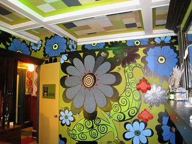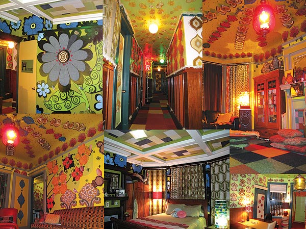 Additionally, I began to contextualize the project in a larger framework and acknowledge artists who had inspired me: Home 1996 – 2008 referenced and borrowed ideas from artists such as Dadaist Kurt Schwitters, who erected the Merzbau, a real-life expressionistic interior, in his studio in Hanover, Germany; feminists Judy Chicago and Miriam Schapiro, who spearheaded Womanhouse - a series of fantasy environments exploring the various personal meanings and gender construction of domestic space; and conceptualist David Ireland, whose work “has a visual presence that makes it seem like part of a usual, everyday situation;” architects and designers such as Verner Panton, who created floor-to-ceiling and back-down-the-walls-to-the-floor, psychedelic interiors in the sixties and seventies, César Manrique, who designed Star Trek-like party spaces; and communities of West Africa, where each year after harvest, women gather to restore and paint their mud dwellings which are washed away by rain every year.