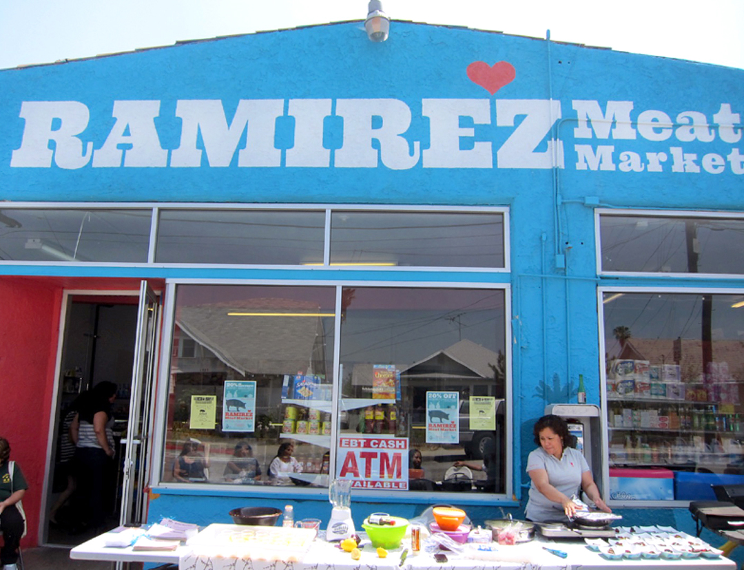 Celia Ramirez, owner of Ramirez Meat Market, leads a healthy cooking demo in front of her recently transformed East Los Angeles store (Market Makeovers // East Los Angeles & Boyle Heights, 2010-2014). Proyecto MercadoFRESCO was supported under a subcontract with the UCLA Center for Population Health and Health Disparities (CPHHD) under Grant No 1P50-105188-01 from the National Heart Lung and Blood Institute (NHLBI).