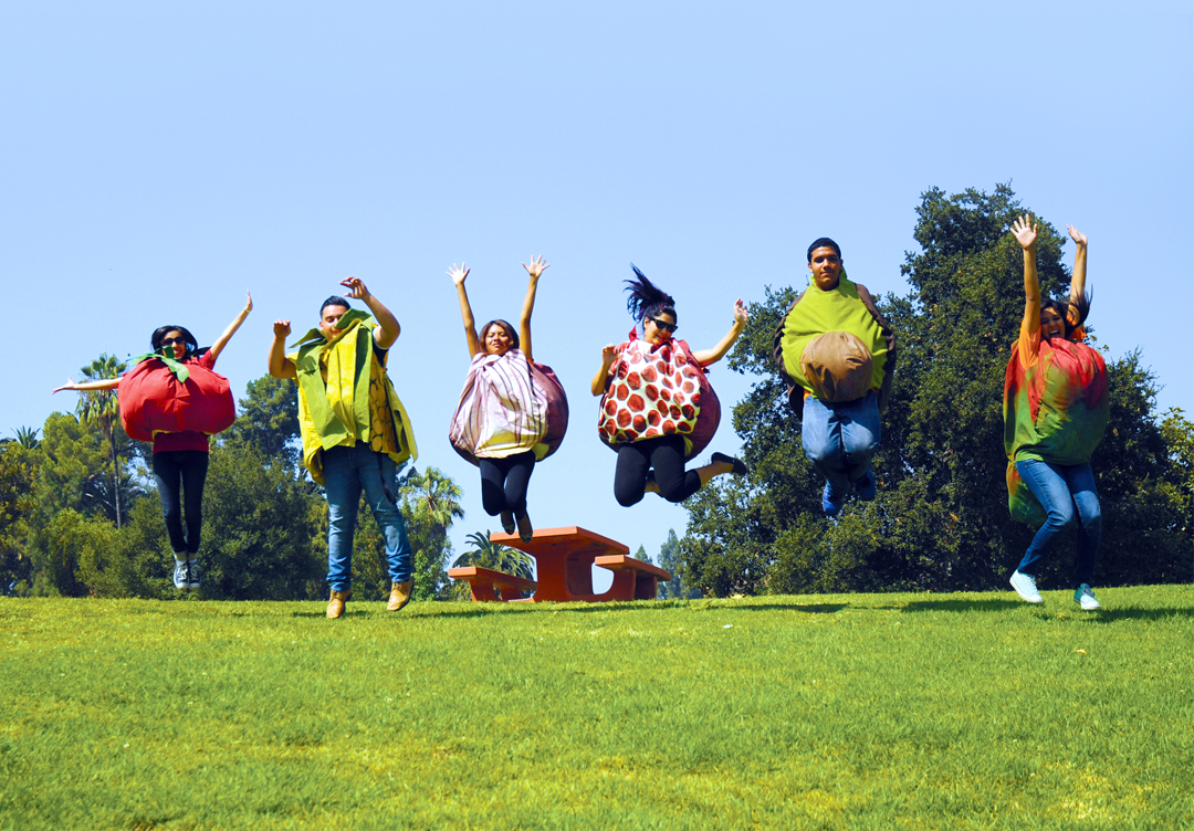 Young folks from East Los Angeles & Boyle Heights promoting healthy food access and healthy eating in costume (Market Makeovers // East Los Angeles & Boyle Heights, 2010-2014). Proyecto MercadoFRESCO was supported under a subcontract with the UCLA Center for Population Health and Health Disparities (CPHHD) under Grant No 1P50-105188-01 from the National Heart Lung and Blood Institute (NHLBI).