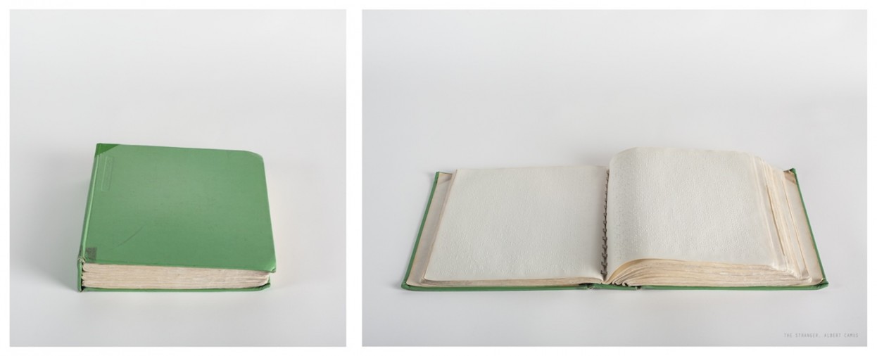 Catherine Wagner. The Stranger, Albert Camus from the series trans/literate, 2011; archival pigment print with braille; edition of five; 21.75 in. x 49.13 in. diptych. Courtesy of the Artist and Stephen Wirtz Gallery, San Francisco.
