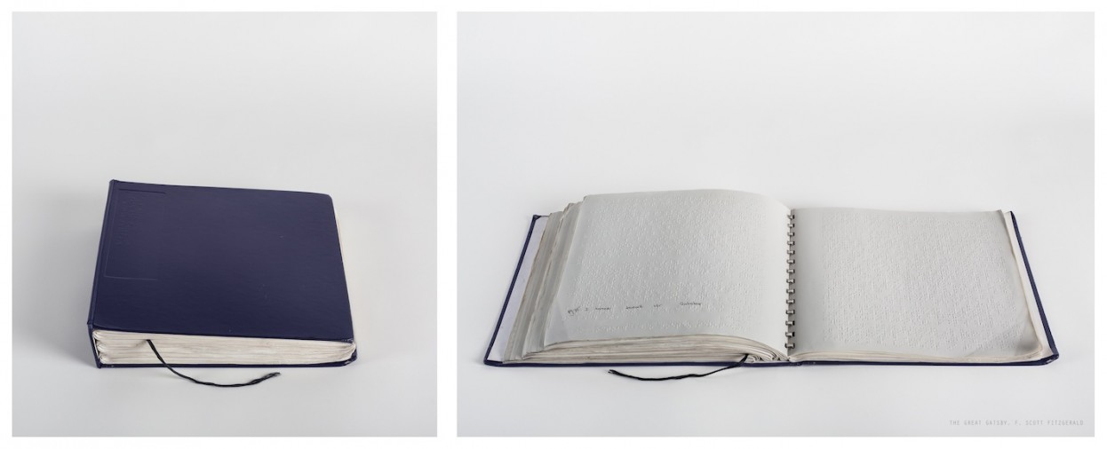 Catherine Wagner. The Great Gatsby, F. Scott Fitzgerald from the series trans/literate, 2011; archival pigment print with braille; edition of five; 21.75 in. x 49.13 in. diptych. Courtesy of the Artist and Stephen Wirtz Gallery, San Francisco.