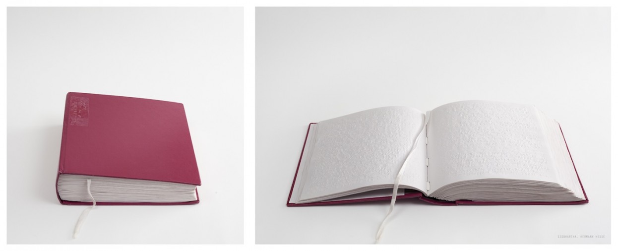 Catherine Wagner. Siddhartha, Hermann Hesse from the series trans/literate, 2011; archival pigment print with braille; edition of five; 21.75 in. x 49.13 in. diptych. Courtesy of the Artist and Stephen Wirtz Gallery, San Francisco.