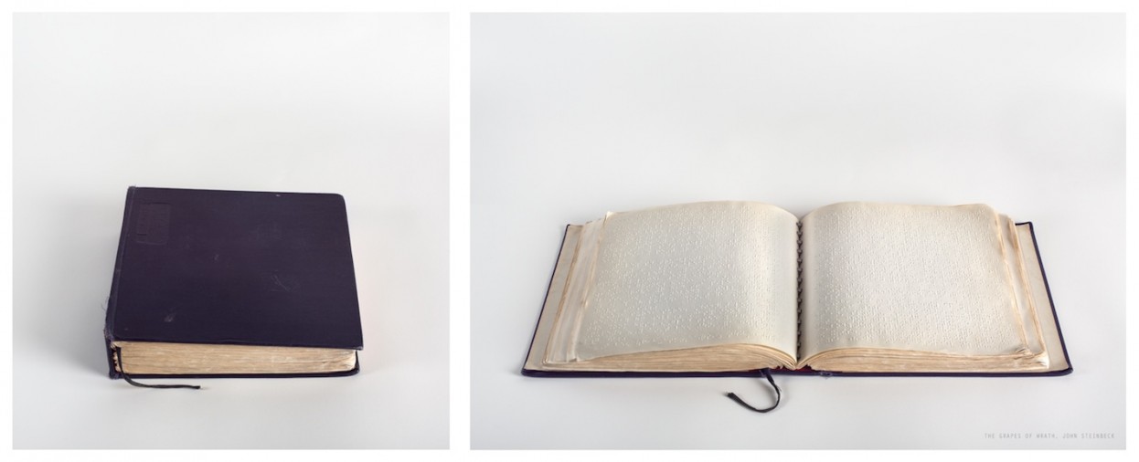 Catherine Wagner. The Grapes of Wrath, John Steinbeck from the series trans/literate, 2011; archival pigment print with braille; edition of five; 21.75 in. x 49.13 in. diptych. Courtesy of the Artist and Stephen Wirtz Gallery, San Francisco.