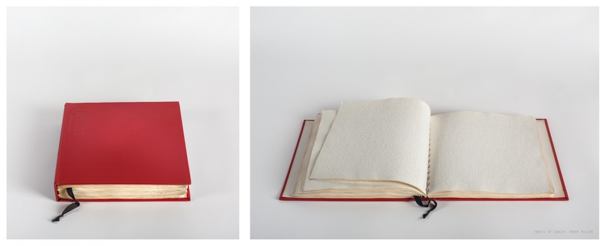 Catherine Wagner. Tropic of Cancer, Henry Miller from the series trans/literate, 2011; archival pigment print with braille; edition of five; 21.75 in. x 49.13 in. diptych. Courtesy of the Artist and Stephen Wirtz Gallery, San Francisco.