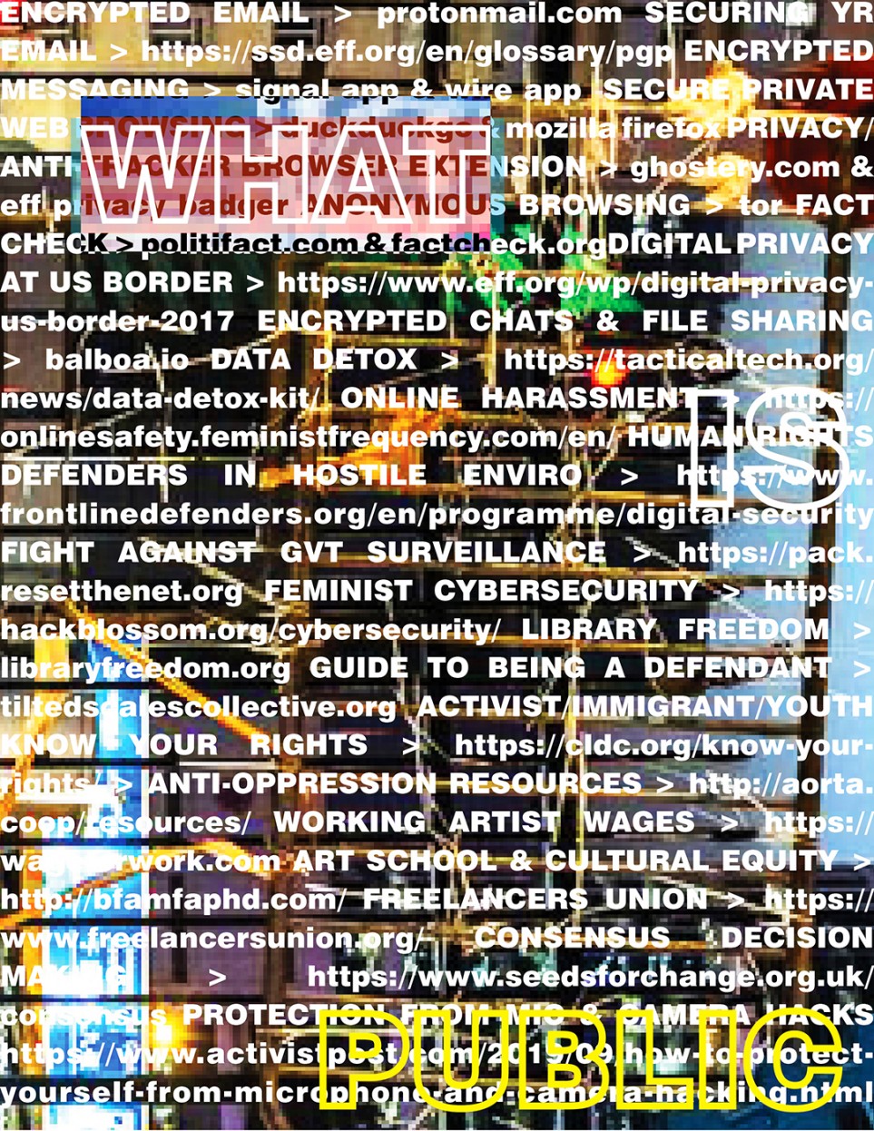 ENCRYPTED EMAIL > protonmail.com SECURING YR EMAIL > https://ssd.eff.org/en/glossary/pgp ENCRYPTED MESSAGING > signal app & wire app SECURE PRIVATE WEB BROWSING > duckduckgo & mozilla firefox PRIVACY/ ANTI-TRACKER BROWSER EXTENSION > ghostery.com & eff privacy badger ANONYMOUS BROWSING > tor FACT CHECK > politifact.com & factcheck.org DIGITAL PRIVACY AT US BORDER > https://www.eff.org/wp/digital-privacy-us-border-2017 ENCRYPTED CHATS & FILE SHARING > balboa.io DATA DETOX > https://tacticaltech.org/news/data-detox-kit/ ONLINE HARASSMENT > https://onlinesafety.feministfrequency.com/en/ HUMAN RIGHTS DEFENDERS IN HOSTILE ENVIRO > https://www. frontlinedefenders.org/en/programme/digital-security FIGHT AGAINST GVT SURVEILLANCE > https://pack.resetthenet.org FEMINIST CYBERSECURITY > https:// hackblossom.org/cybersecurity/ LIBRARY FREEDOM > libraryfreedom.org GUIDE TO BEING A DEFENDANT > tiltedscalescollective.org ACTIVIST/IMMIGRANT/YOUTH KNOW YOUR RIGHTS > https://cldc.org/know-your-rights/ > ANTI-OPPRESSION RESOURCES > http://aorta.coop/resources/ WORKING ARTIST WAGES > https://wageforwork.com ART SCHOOL & CULTURAL EQUITY > http://bfamfaphd.com/ FREELANCERS UNION > https://www.freelancersunion.org/ CONSENSUS DECISION MAKING > https://www.seedsforchange.org.uk/consensus PROTECTION FROM MIC & CAMERA HACKS https://www.activistpost.com/2019/09/how-to-protect-yourself-from-microphone-and-camera-hacking.html