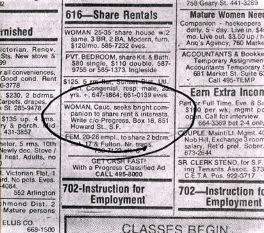 Roommate Ad from the Roberta Breitmore Meet Mr. America series, 1974; newspaper advertisement. Courtesy of the Artist.