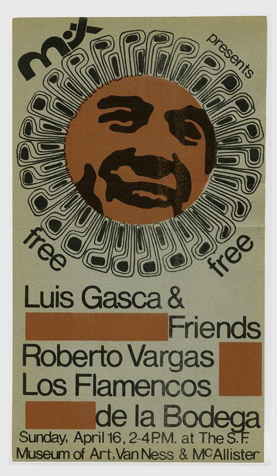 Graphic poster promoting free performance of Luis Gasca & Friends, Roberto Vargas, and Los Flamencos de la Bodega at SFMA, San Francisco, April 1972. Courtesy of SFMOMA.