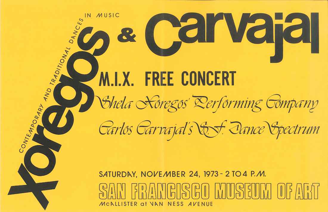 Graphic poster promoting the free MIX concert by Xoregos Dance Co. and Carlos Carvajal Dance Spectrum. Courtesy of SFMOMA.