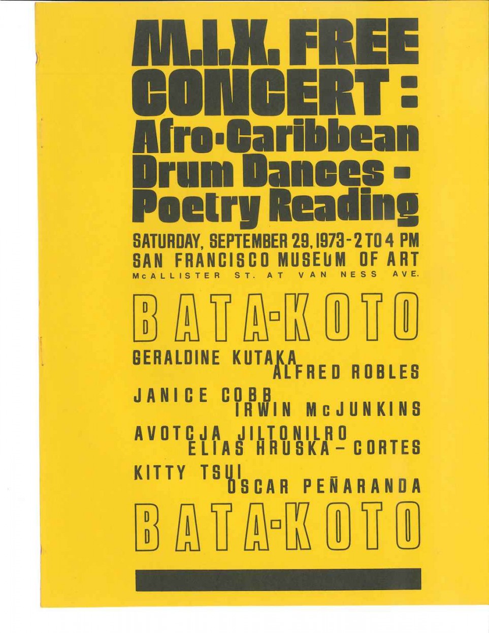 Graphic poster promoting free MIX concert of Afro-Caribbean Drum Dances and Poetry Reading at SFMA at Van Ness Avenue, San Francisco, September 1973. Courtesy of SFMOMA.