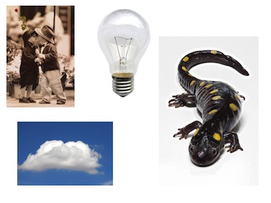 Slide from presentation given at "The Social Beyond Anthropocentrism"; panel in conjunction with Göteborg release of Paletten Art Journal #286-287, February 14, 2012, Valand School of Fine Arts, Göteborg, Sweden. Images: Pictures of a first kiss; a lightbulb; a salamander; a cloud.