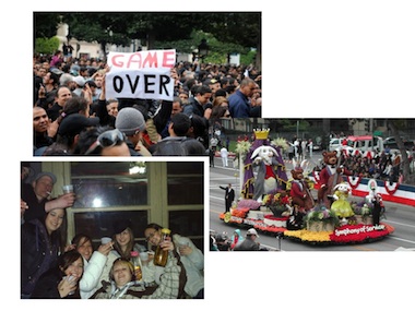Slide from "The Social Beyond Anthropocentrism” panel presentation, Valand School of Fine Arts, Göteborg, Sweden. Images: snapshots from a protest; a parade; a party.