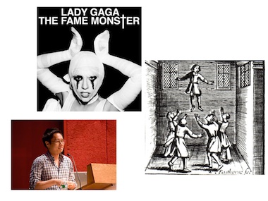 Slide from "The Social Beyond Anthropocentrism” panel presentation, Valand School of Fine Arts, Göteborg, Sweden. Images: Album cover from Lady Gaga’s The Fame Monster (2009, Interscope Records); illustration of children performing witchcraft; photograph of Paul Chan giving a lecture.