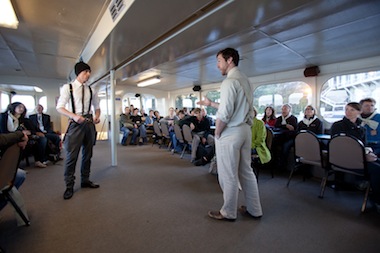 Actors Ross Travis and Nick Trengove perform a scene from Hamlet on the Alcatraz Ferry. Courtesy of the We Players. Photo: Peter Merts