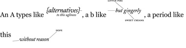 The endnotes of this essay appear in one of Paul Chan’s 11 Alternumerics fonts, which can be downloaded for free from his website. In one, The Future Must Be Sweet—After Fourier (2001), each typed letter is comprised of a map of words. It is based on a system of key-for-key substitutions: