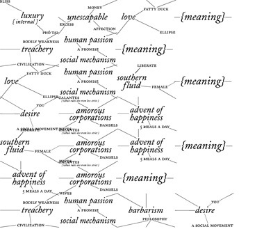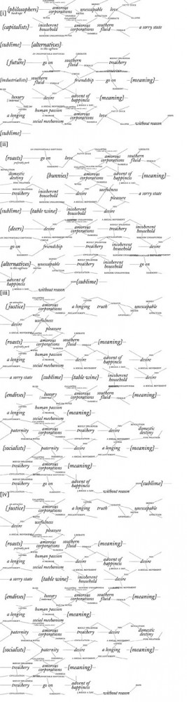 If you download this font and use it on your computer, as you type, each of your letters is transformed into a small system of words that connects by way of open-ended lines to the ones above, beside, and below it. The words that replace your letters are based on the philosophy of Charles Fourier, a utopian socialist who, according to Chan, “believed everyone should have equal access to justice, affection, and fine foods.” 5,i As a person types, a diagram is produced that takes (invented) fragments of Fourier’s thought and arranges them into what Chan calls a multilinear narrative. Or, a: