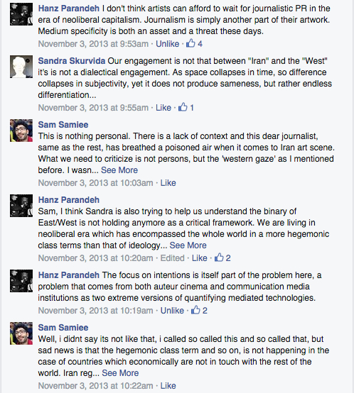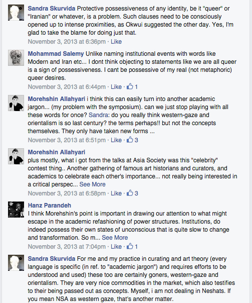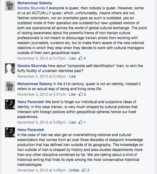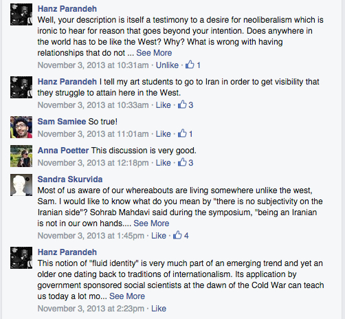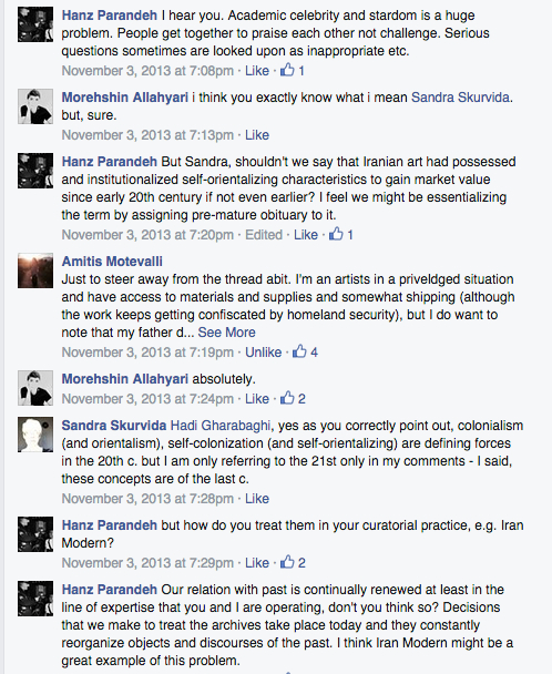 In such a transient space, peer networks and collaborations pop up as ephemeral zones of knowledge production, but this process flows and ebbs along with the circumstances of the participants who, without a sustaining, institutional framework, may disperse or disappear from the discourse. Self-organized models are vital spaces of resistance in a totalitarian state. As such, they resist systematic documentation—various Web archives do not comprise a history—and the recent histories of contemporary Iranian art do not reach into the social-media currents, websites, and networks where a new type of creativity emerges, free from dictates of the Western art market and its proverbial orientalist gaze. Yet information that does flow freely is diverted into the rabbit holes of social media. In the semi-private space copyrighted by Facebook, such run-offs reveal the vicissitudes of knowledge production in which art constitutes a specific form of information.