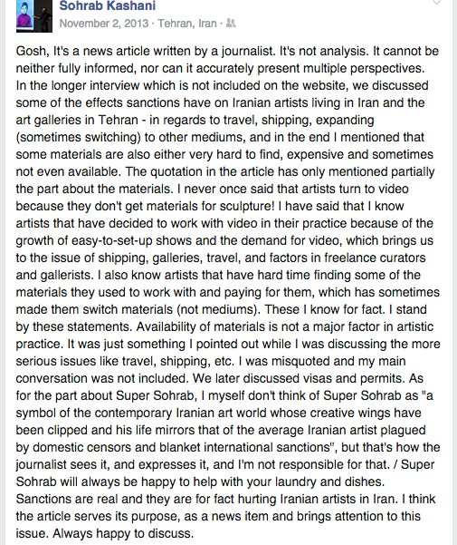 1. Saeed Kamali Dehghan, “Iran’s artists warn US and European sanctions are affecting their work,” The Guardian, October 31, 2013, http://www.theguardian.com/world/2013/oct/31/iran-artists-sanctions-affecting-work.